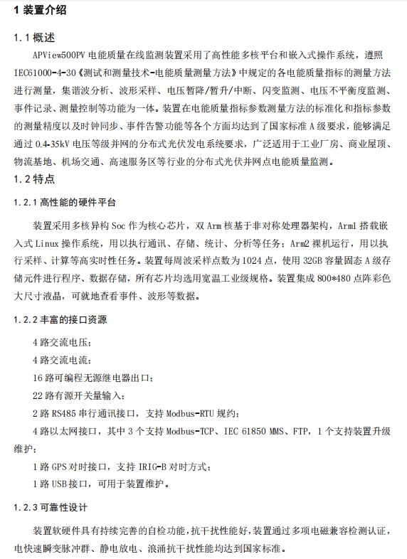 APView500PV 电能质量在线监测装置采用了高性能多核平台和嵌入式操作系统,遵照IEC61000-4-30《测试和测量技术-电能质量测量方法》中规定的各电能质量指标的测量方法进行测量,集谐波分析、波形采样、电压暂降/暂升/中断、闪变监测、电压不平衡度监测、事件记录、测量控制等功能为一体。装置在电能质量指标参数测量方法的标准化和指标参数的测量精度以及时钟同步、事件告警功能等各个方面均达到了国家标准 A 级要求,能够满足通过 0.4-35kV 电压等级并网的分布式光伏发电系统要求,广泛适用于工业厂房、商业屋顶、物流基地、机场交通、高速服务区等行业的分布式光伏并网点电能质量监测。 |